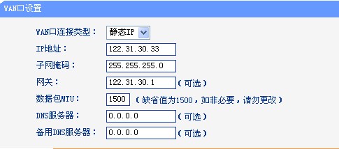 2、在左边框中选择“网络参数”→“WAN口设置”,然后在右边框中的“WAN口连接类型”选择“静态IP”,在相应栏目填入IP地址(IP Address)、子网掩码(Subnet Mask)、网关(Gateway)、以及DNS服务器地址。